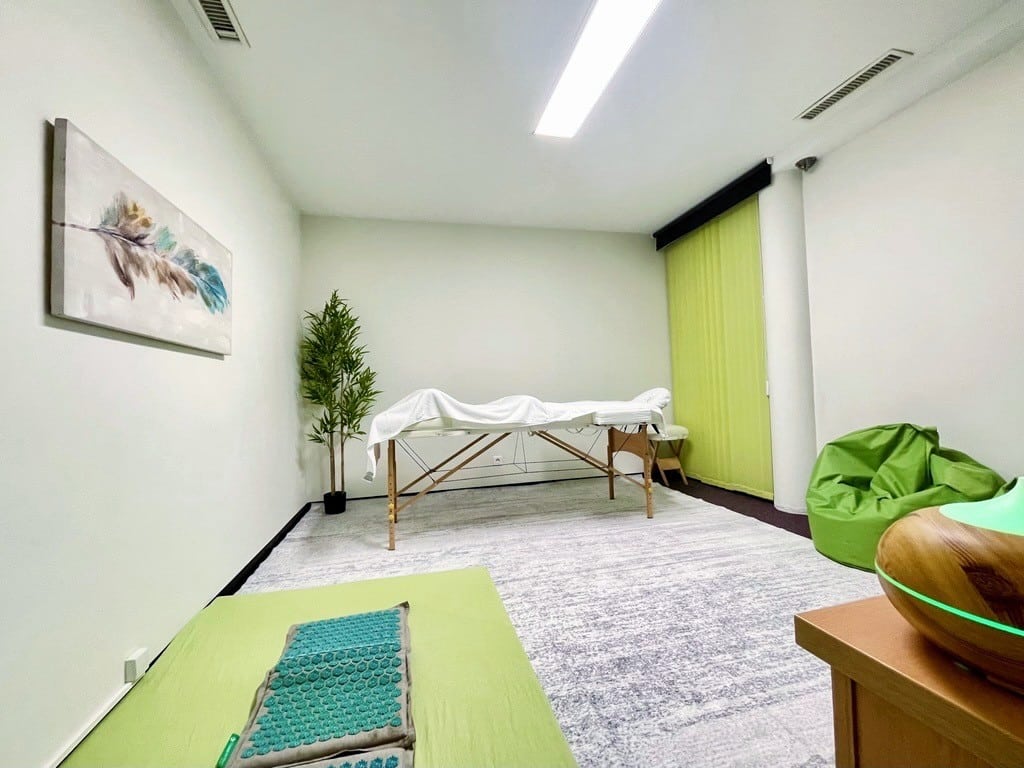 Équipé d’une table de massage et de tapis de fleurs pour la relaxation, cet espace favorise la détente profonde et le recentrage. Il peut également accueillir, selon les besoins, l’intervention de professionnels du bien-être (kinésithérapeute, masseur·se…).
